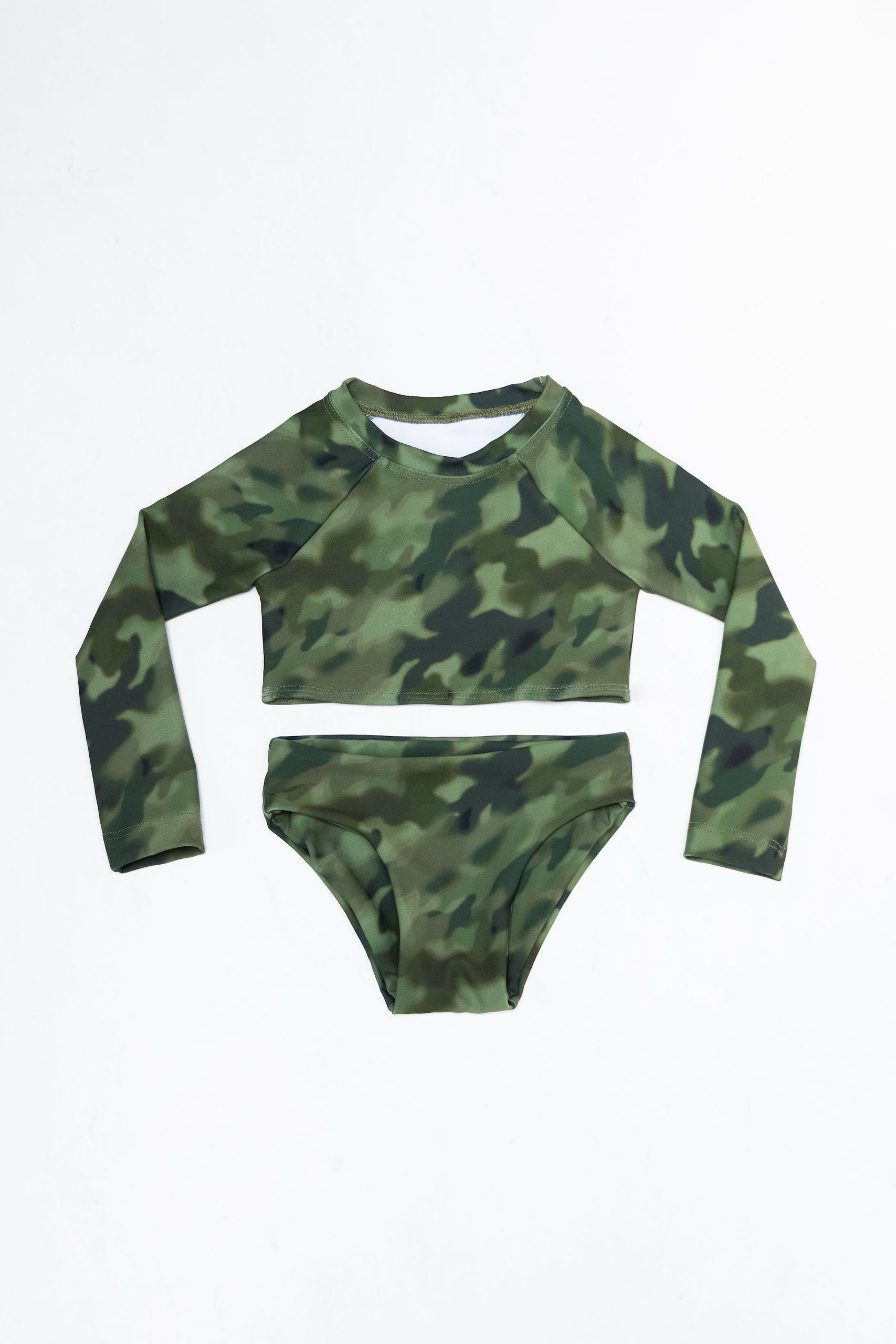 The Quincy set comes with a long sleeve rashguard-style top and coordinating bottoms, perfect for long days in the sun with your mini!