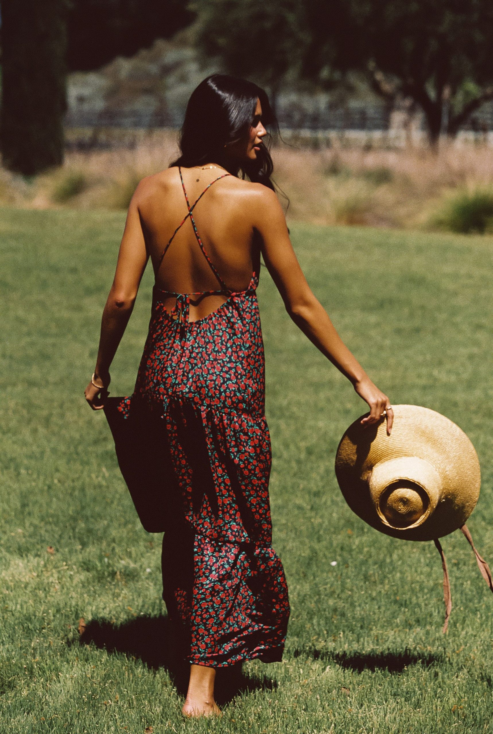 Campbell is a tiered maxi dress with an adjustable, customizable top that can be tied multiple ways depending on the look you want.