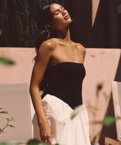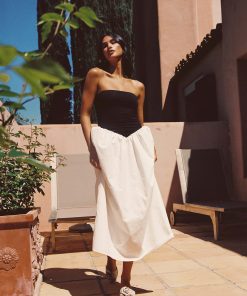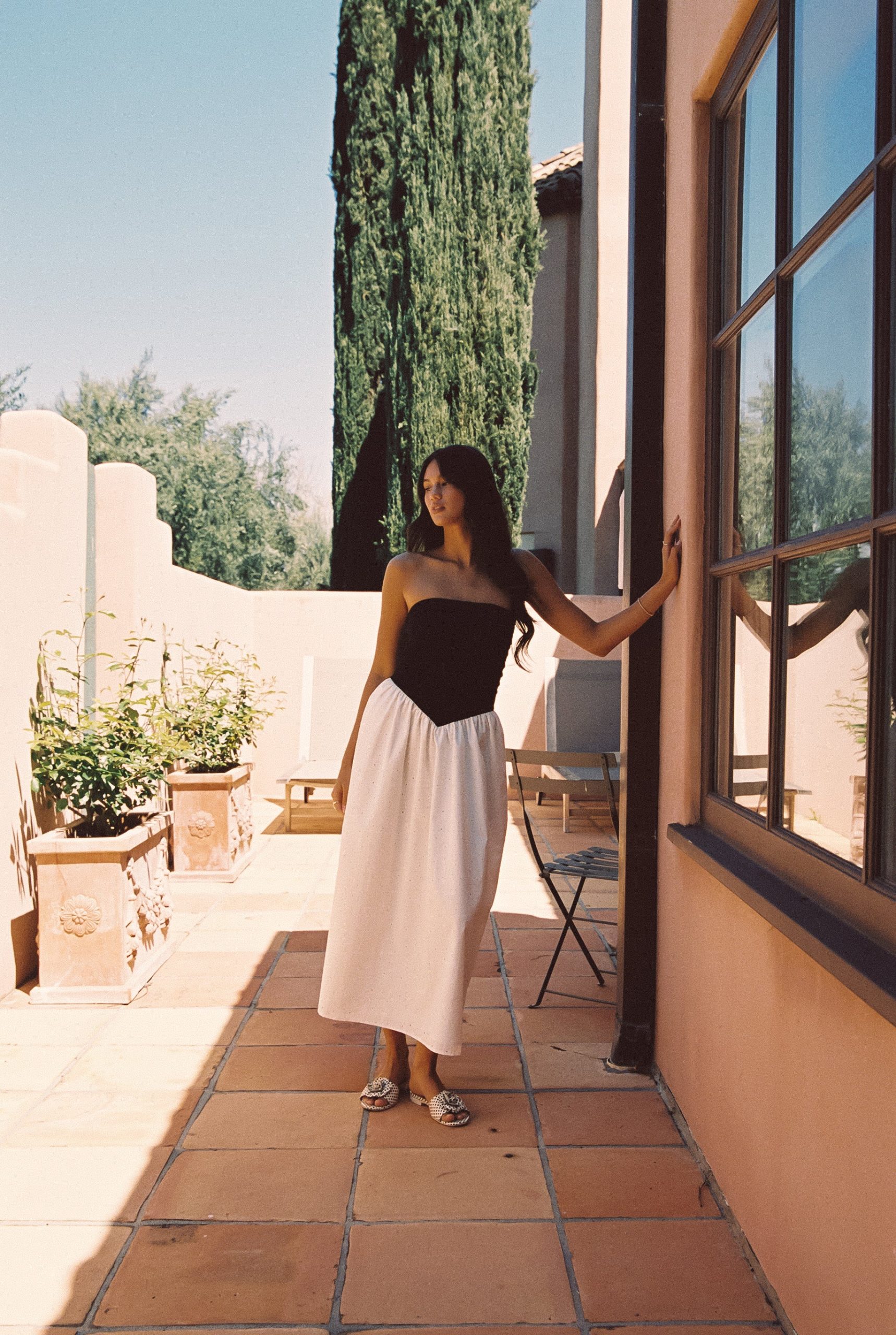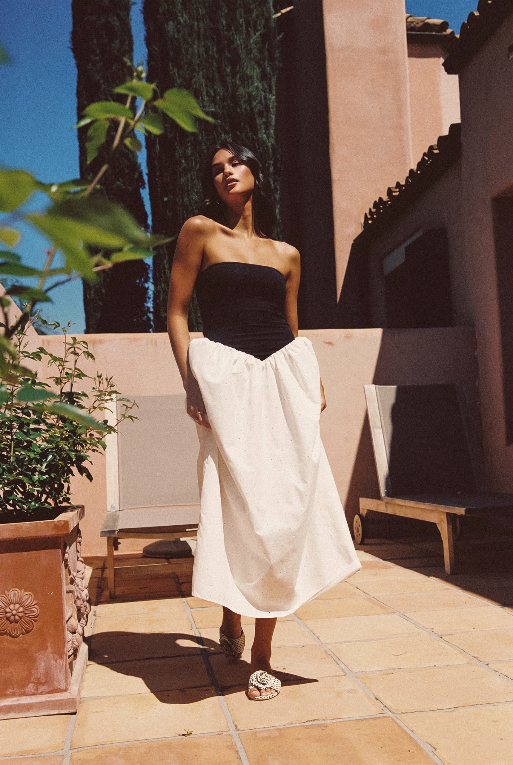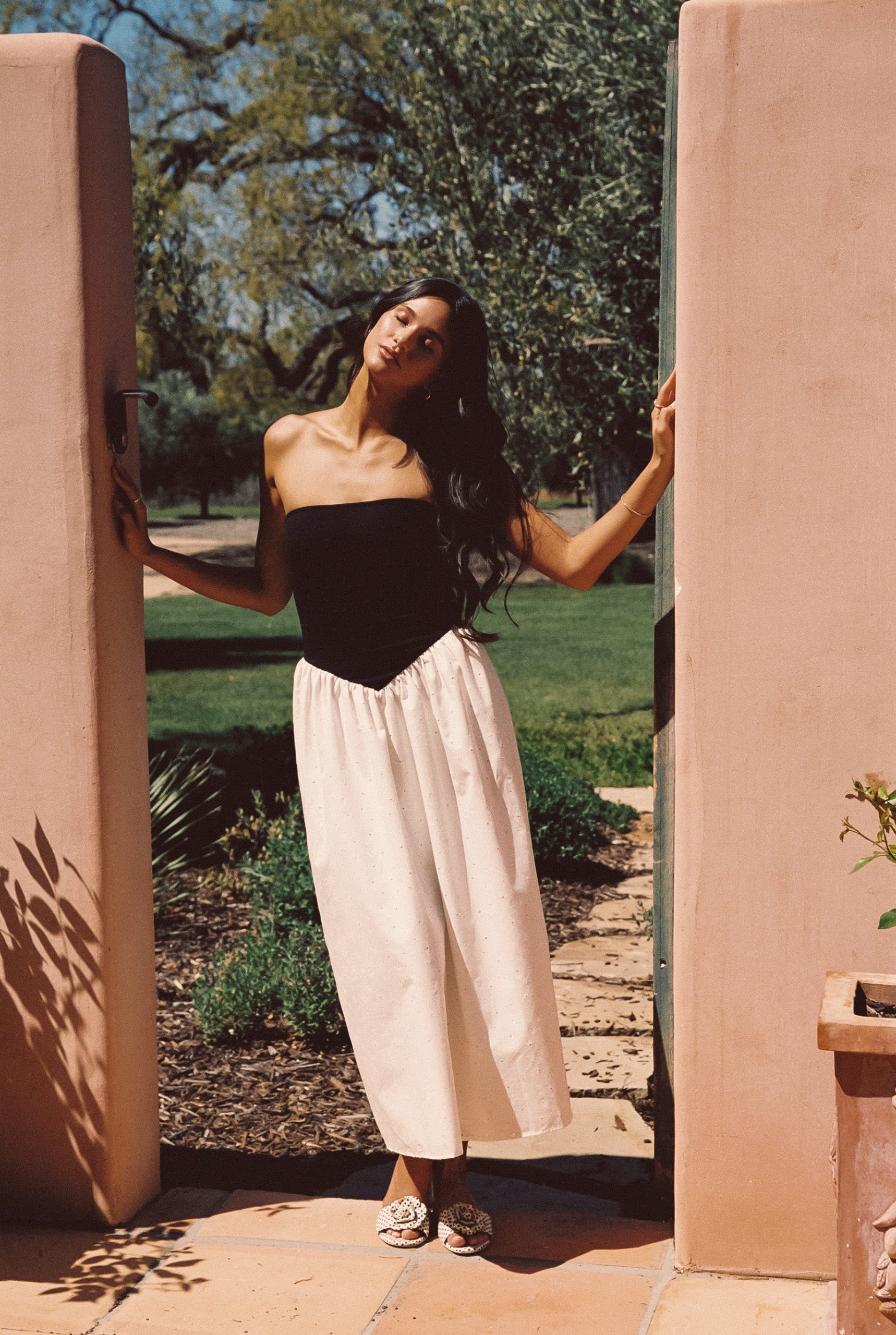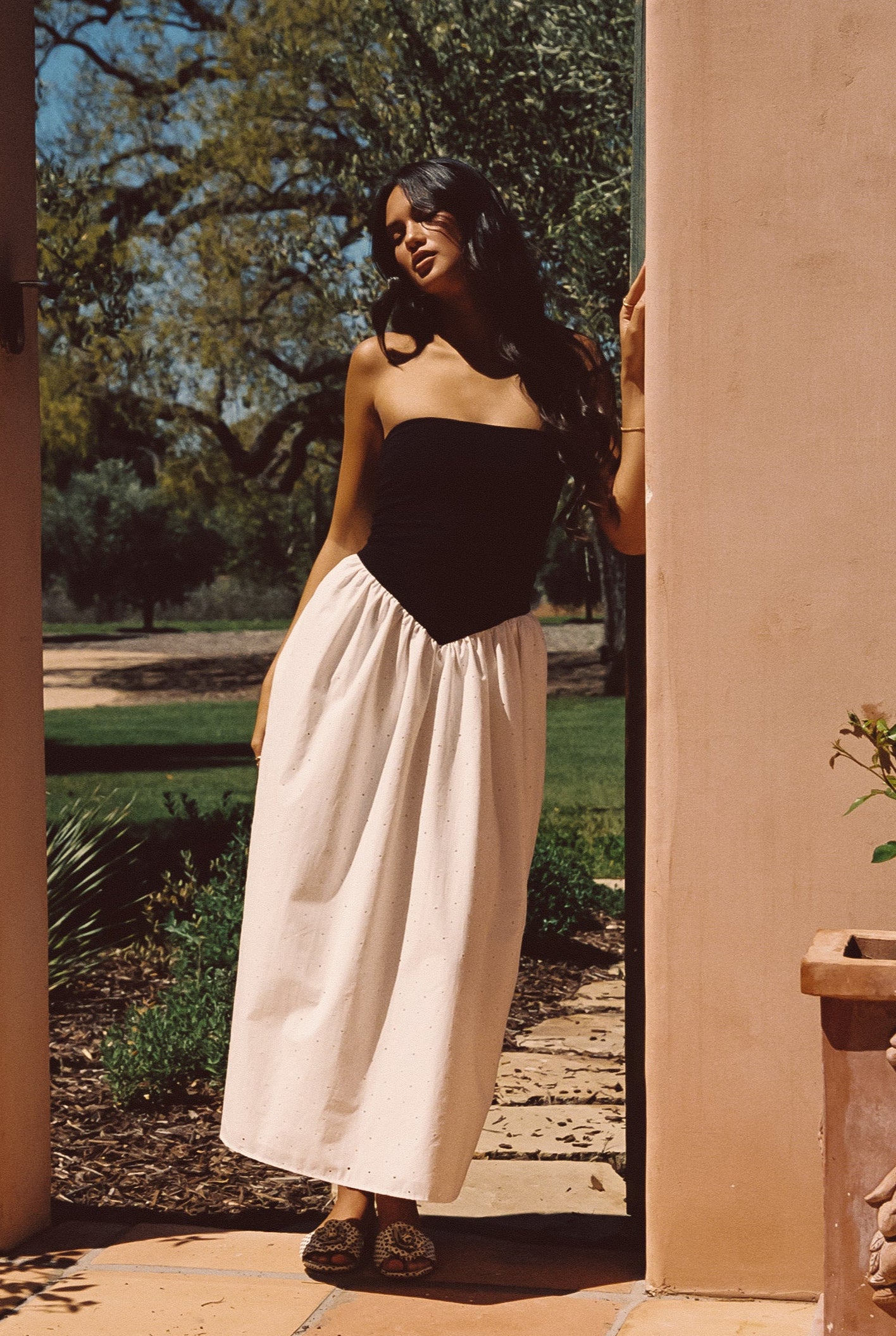 The top of this drop-waist strapless midi dress is made from our soft jersey that sucks you in, and the white summery eyelet skirt is inspired by our best-selling dress from last summer, Bella.