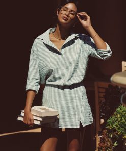 Harper is the perfect menswear-inspired shirt that’s long enough to be worn alone but pairs perfectly with our Brooks pants for a super chic set.