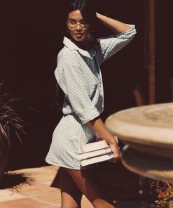 Our seersucker fabric has a slight texture to it, it’s what you think of when you think of a classic seersucker fabric. It has a little bit of stretch to it, so don’t feel like you have to size up with our seersucker styles.