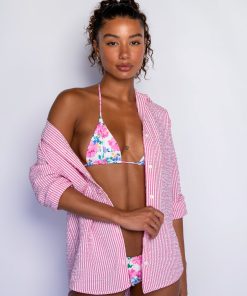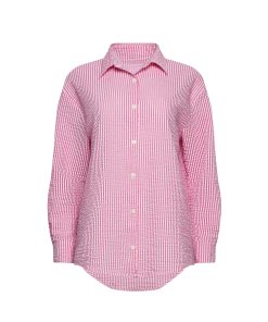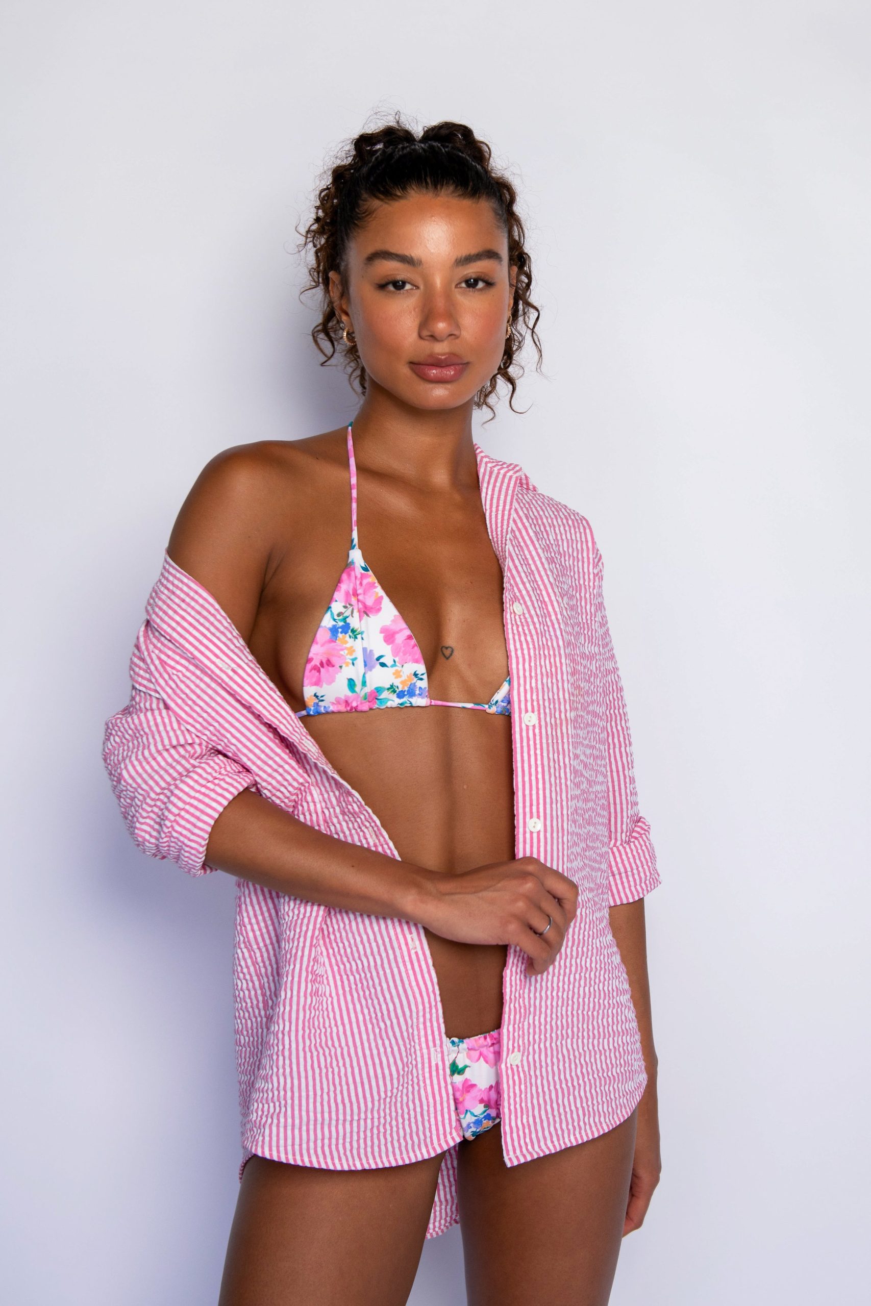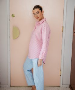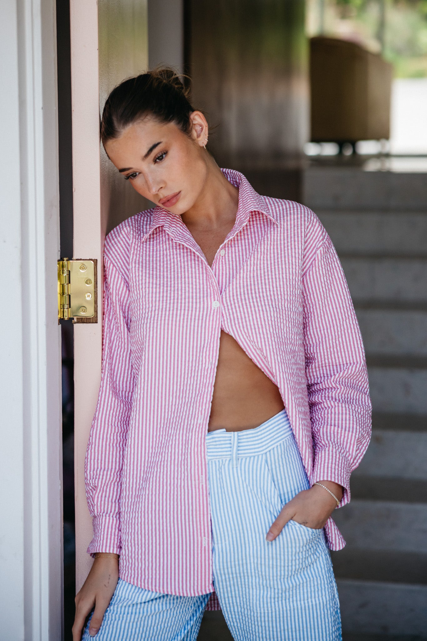Our seersucker fabric has a slight texture to it, it’s what you think of when you think of a classic seersucker fabric. It has a little bit of stretch to it, so don’t feel like you have to size up with our seersucker styles.