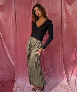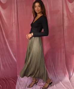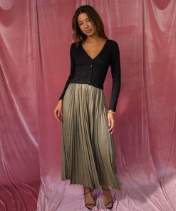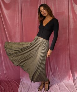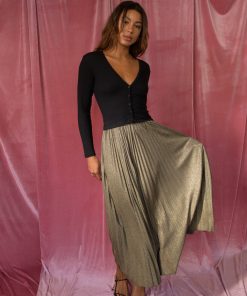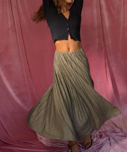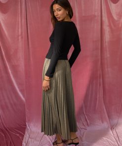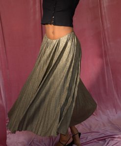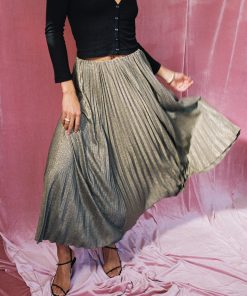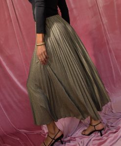 This accordion gold pleated ankle length skirt has a hidden elastic waistband that’s thick yet stretchy and gives no pinch. The skirt moves as you walk and gives you the prettiest silhouette.