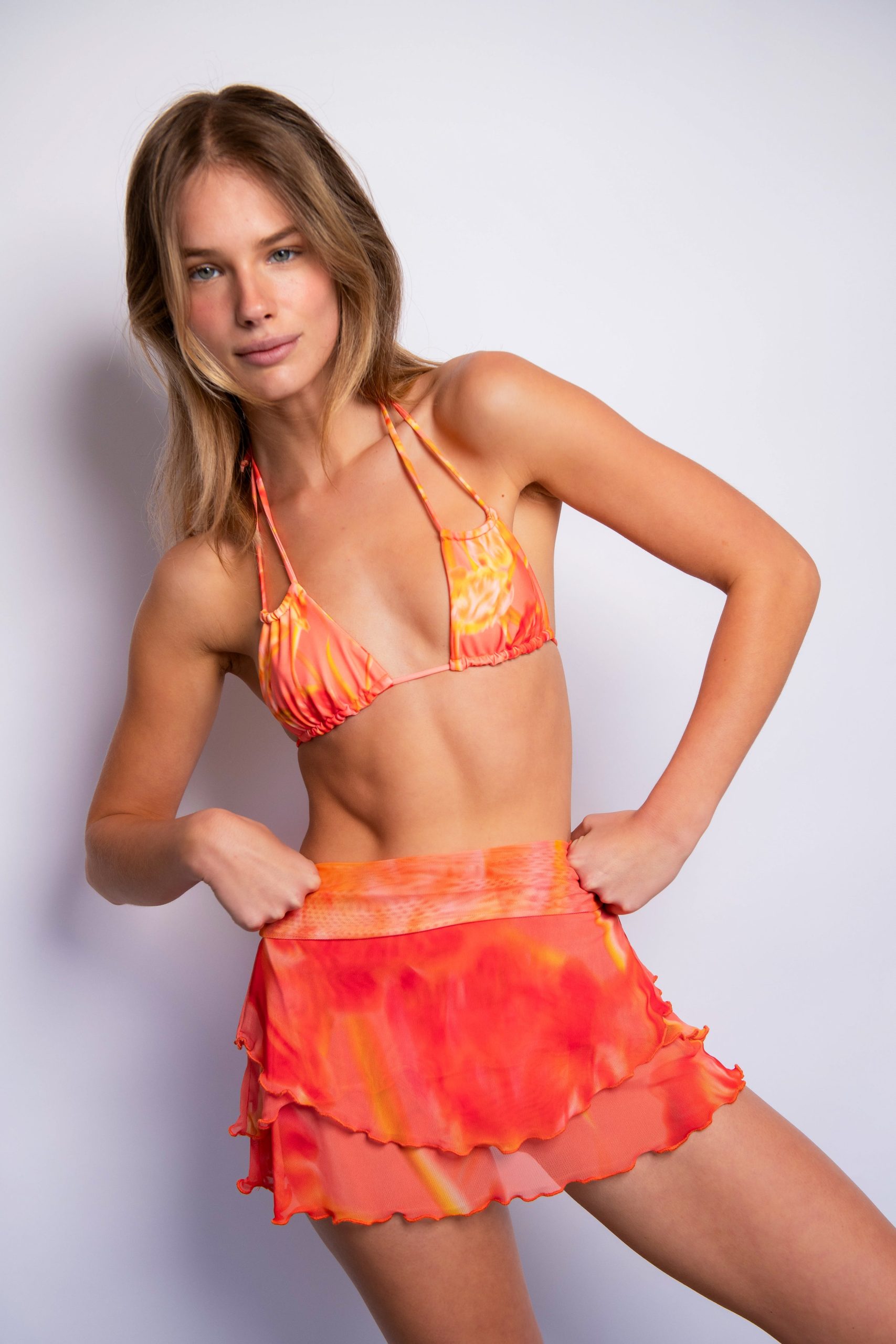 This perfect flirty mesh mini has an extra long band that can be worn rolled for a low rise nostalgic mini skirt girly vibe, or just as a simple higher waist band because we love options here at Skatie! One of those pieces that you might wear as a cover-up but can definitely be worn out and about as an outfit.