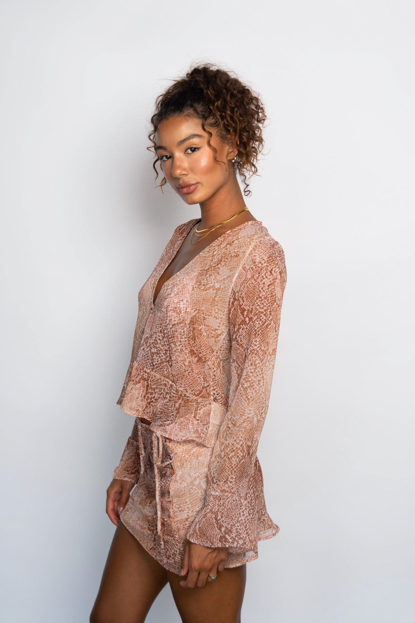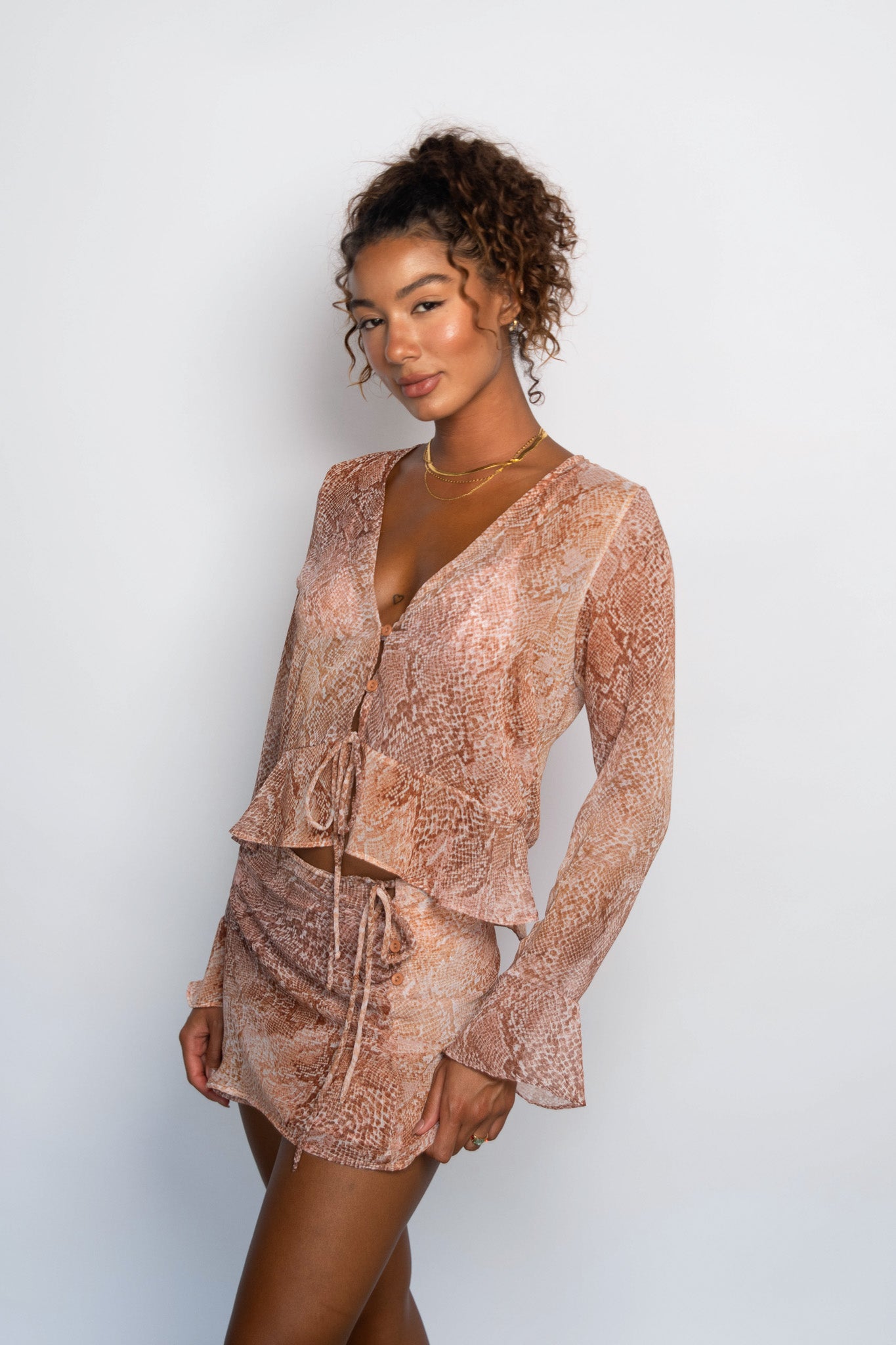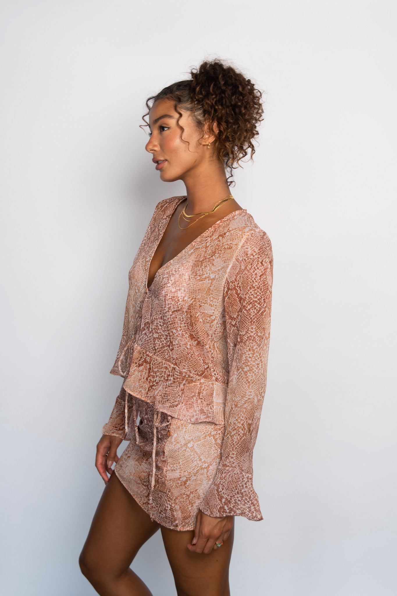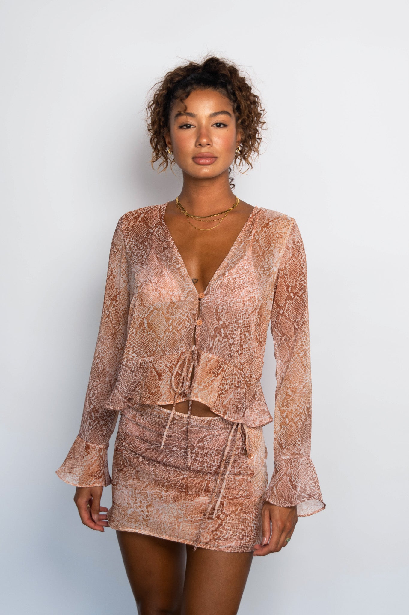 This v-neck blouse has a two-button closure and a tie at the waist, just above where the ruffled hem begins. The single-layer chiffon is slightly sheer, making Colette feel a little bit edgy.