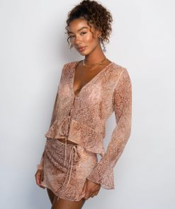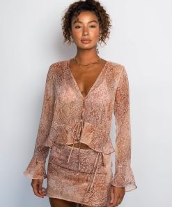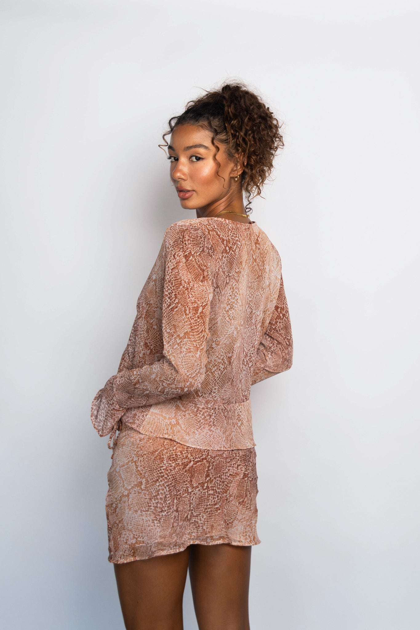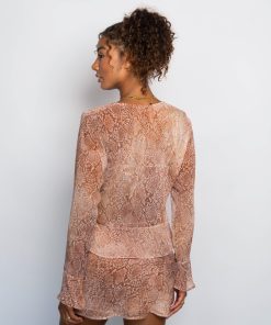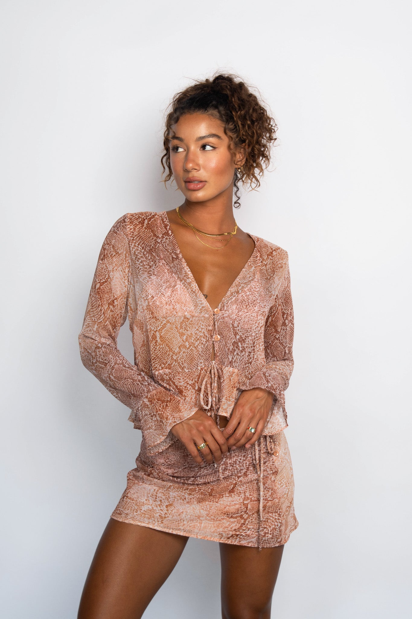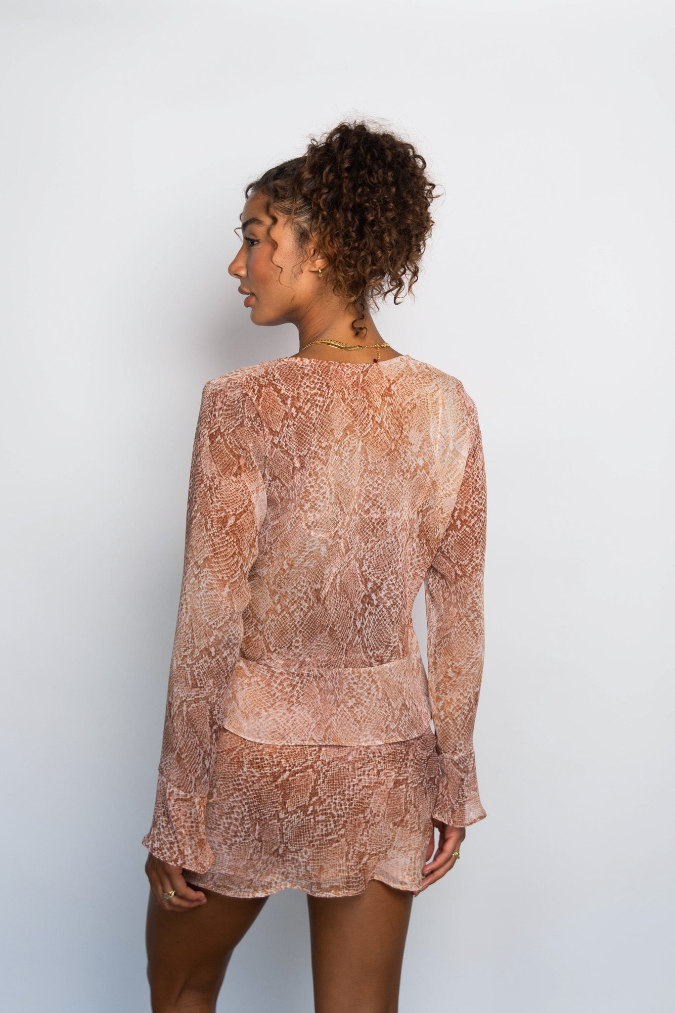 This v-neck blouse has a two-button closure and a tie at the waist, just above where the ruffled hem begins. The single-layer chiffon is slightly sheer, making Colette feel a little bit edgy.