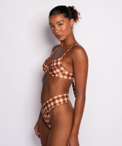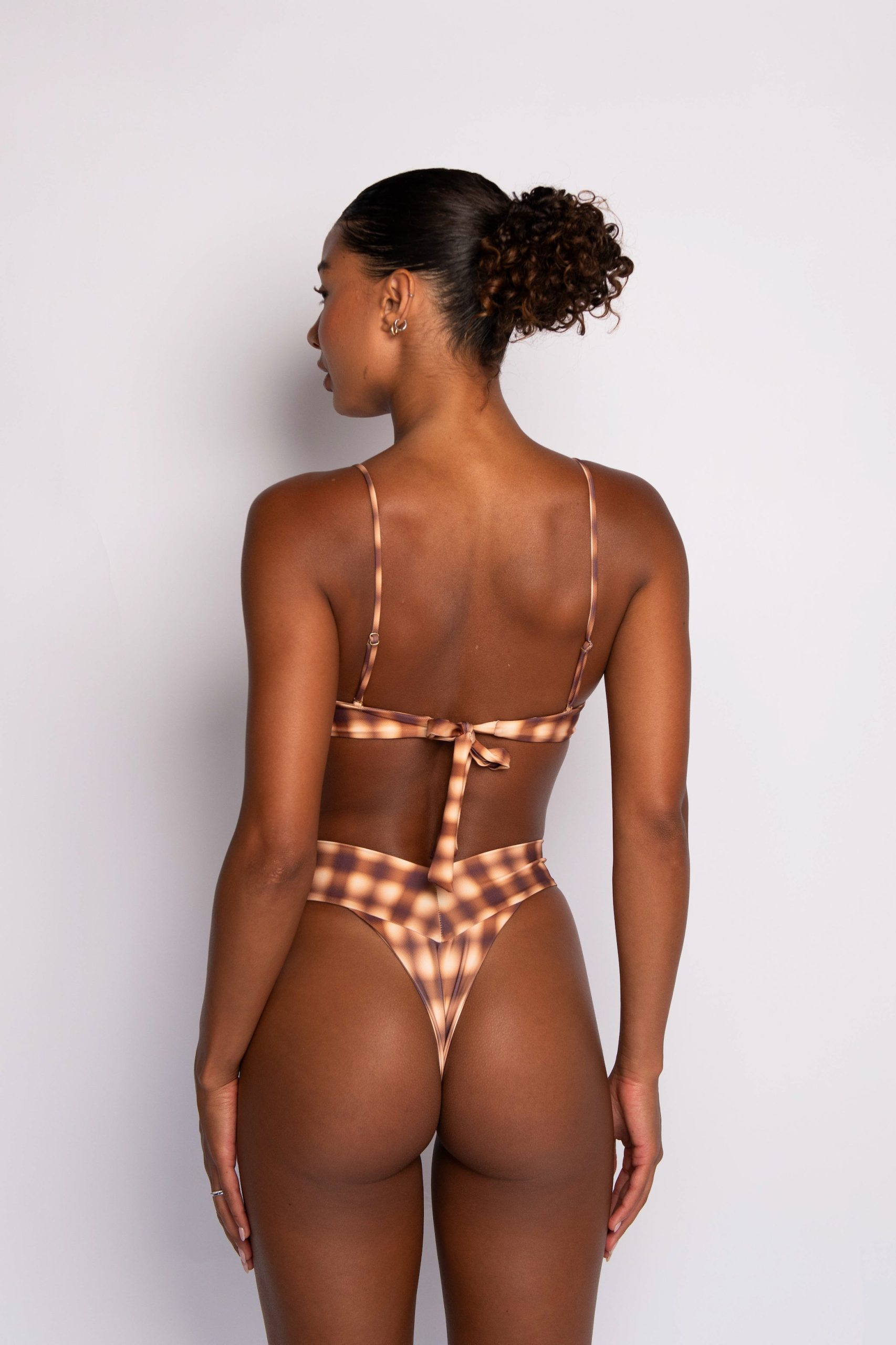 Sizing: Kate has good coverage, so if you want good cleavage, size down. She ties in the back for a customizable band fit.