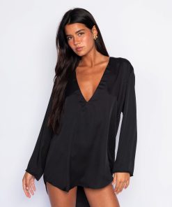 Growing up in the Midwest I always saw the cutest little printed tunics whenever we vacationed anywhere. This is our take on that preppy throw on style. Short enough to wear as a top, but long enough to be a micro-mini dress. She’s floaty without being oversized + the v front is a sexier vibe.