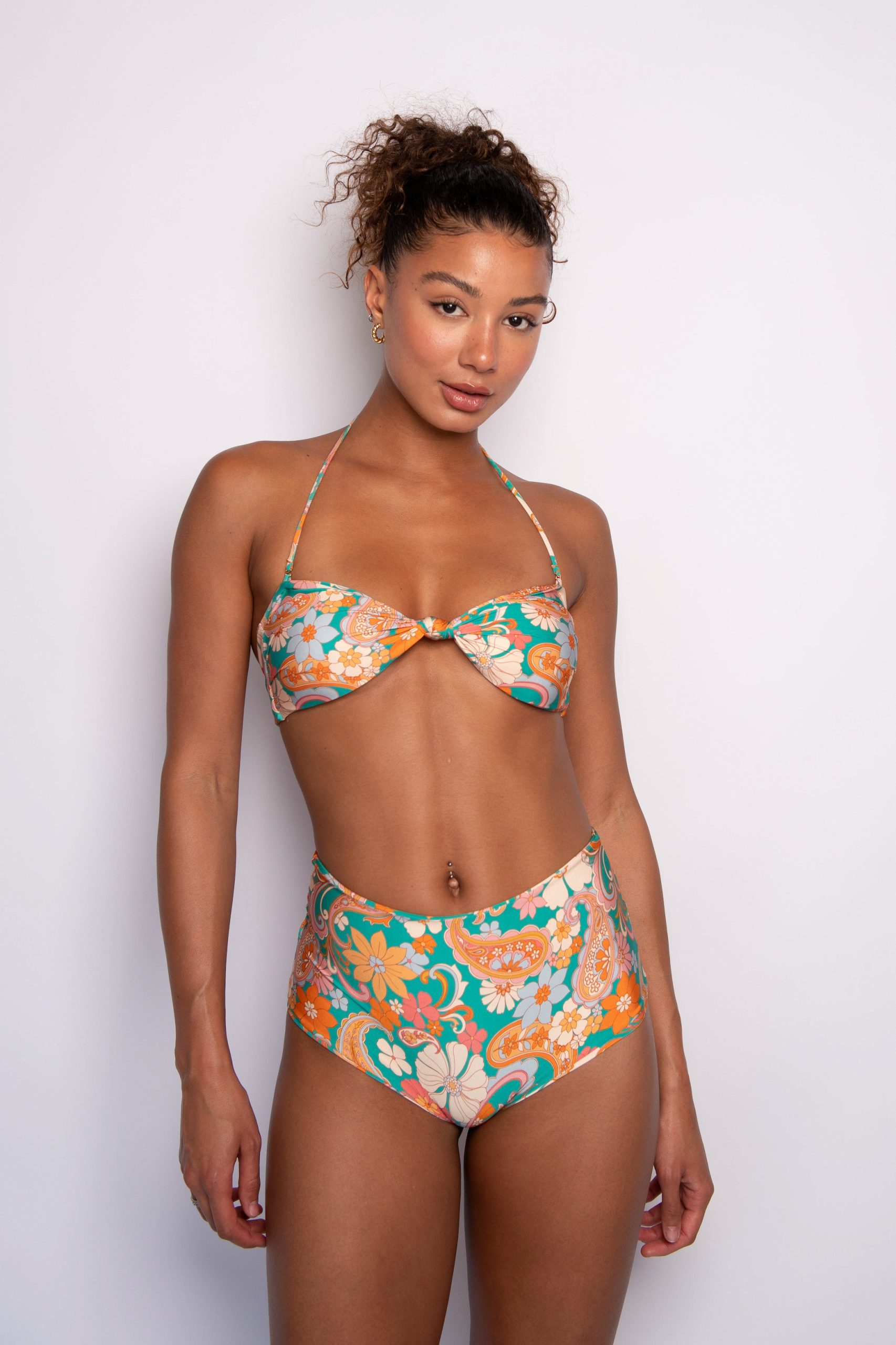 Lyndi is a knotted bandeau with removable halter straps. This top has structured sides that keep her in place, but her skimpy coverage makes her perfect for tanning! She’s got removable padding that allows the top to hold better shape.